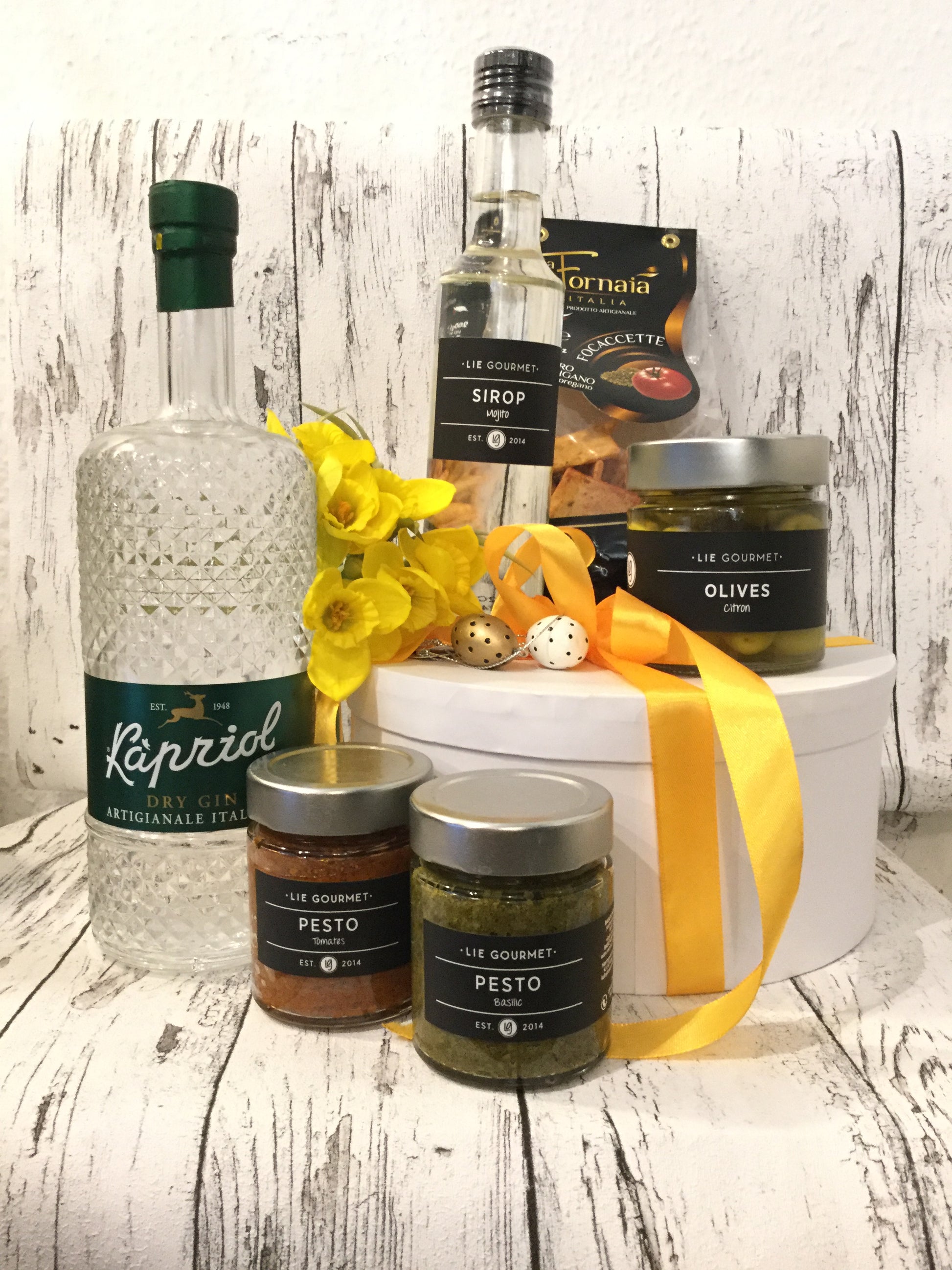 Excellence kurven til ham og hende. Blandet kurv med kaffe, te samt vin, gin, likør, øl og rom. Chokolade og sennep, Hybengårdens marmelade. Chips, kiks eller chokolade mv.