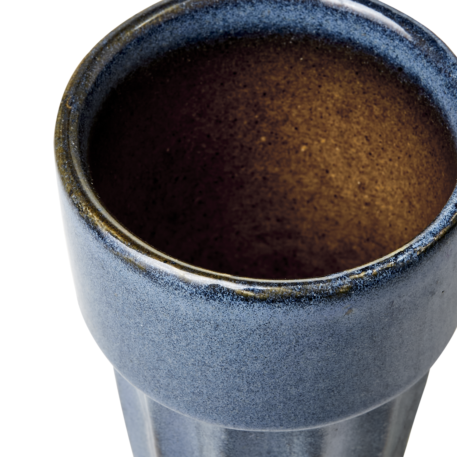Lattekop har et slankt, stilfuldt design med lodrette riller, der skaber et moderne og struktureret udseende. Farverne har en rustik kombination af blå og brun nuancer, som giver en tekstureret og håndlavet følelse.
