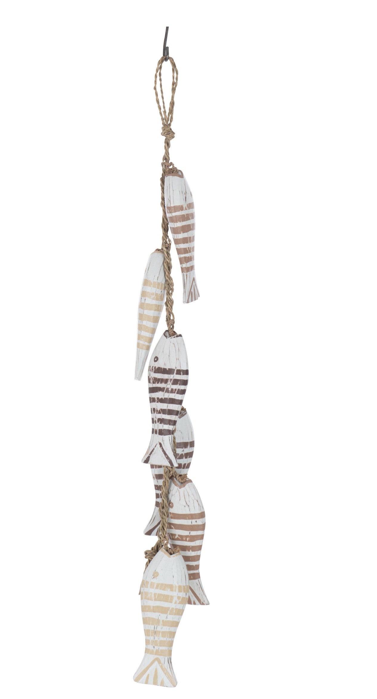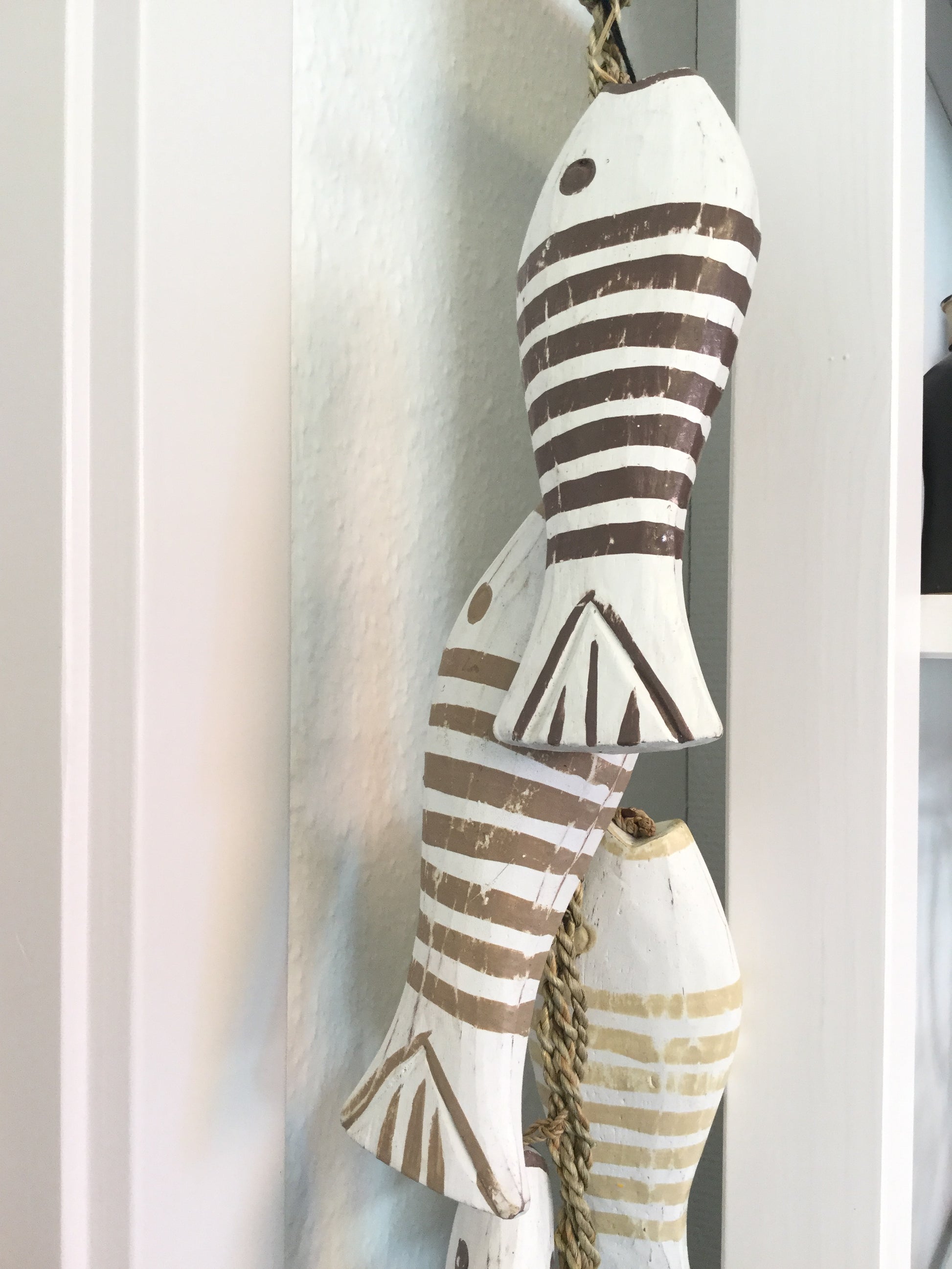 Maritime træ dekoration i Albasia træ, fisk i brun og hvide farve nuancer.