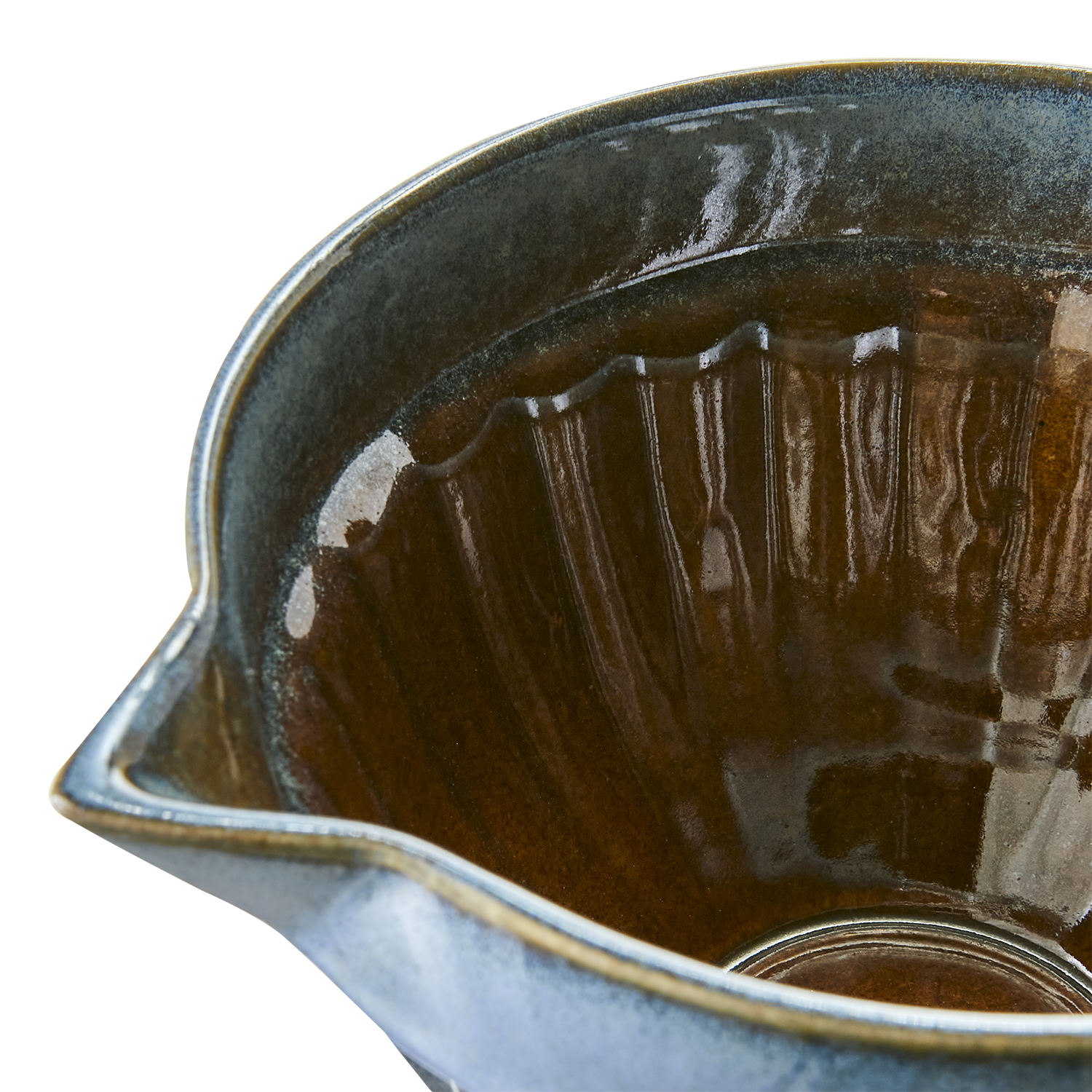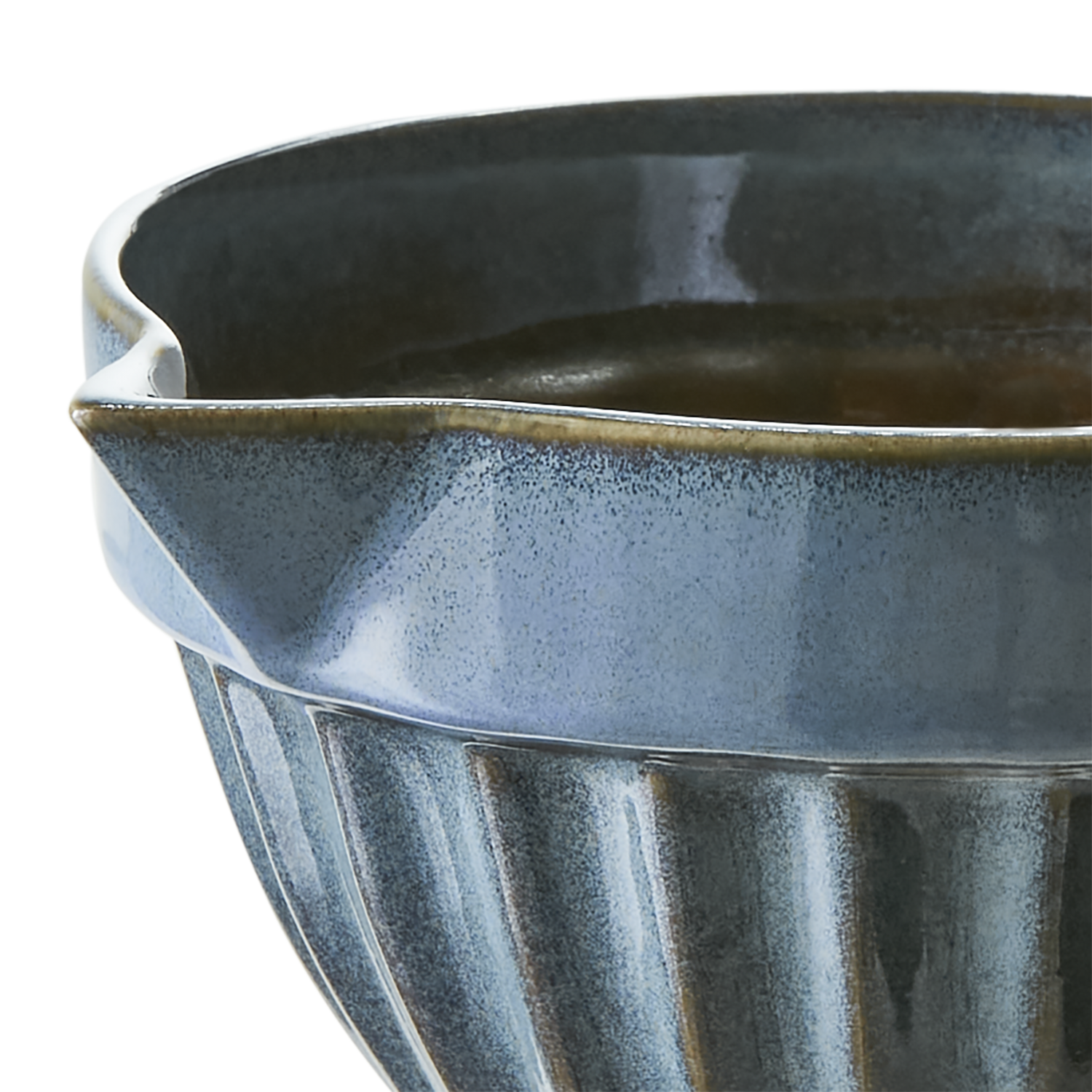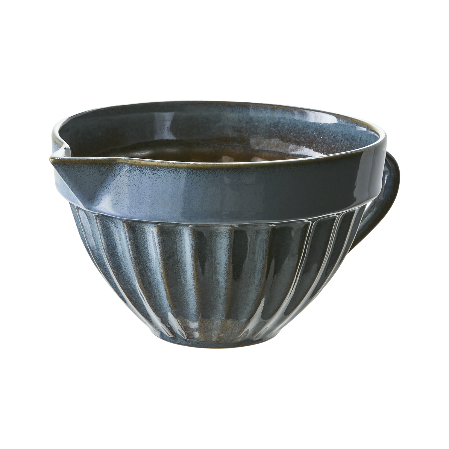 Stentøjs skål med hældetud i blå og brune farver.