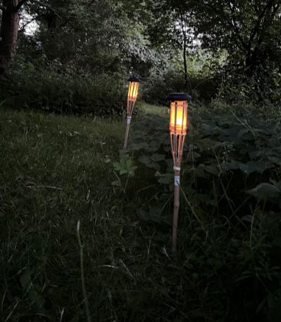Flot udendørs faklen har frosted glas og sort hat med solcelle panel. Den tænder og slukker efter behov.