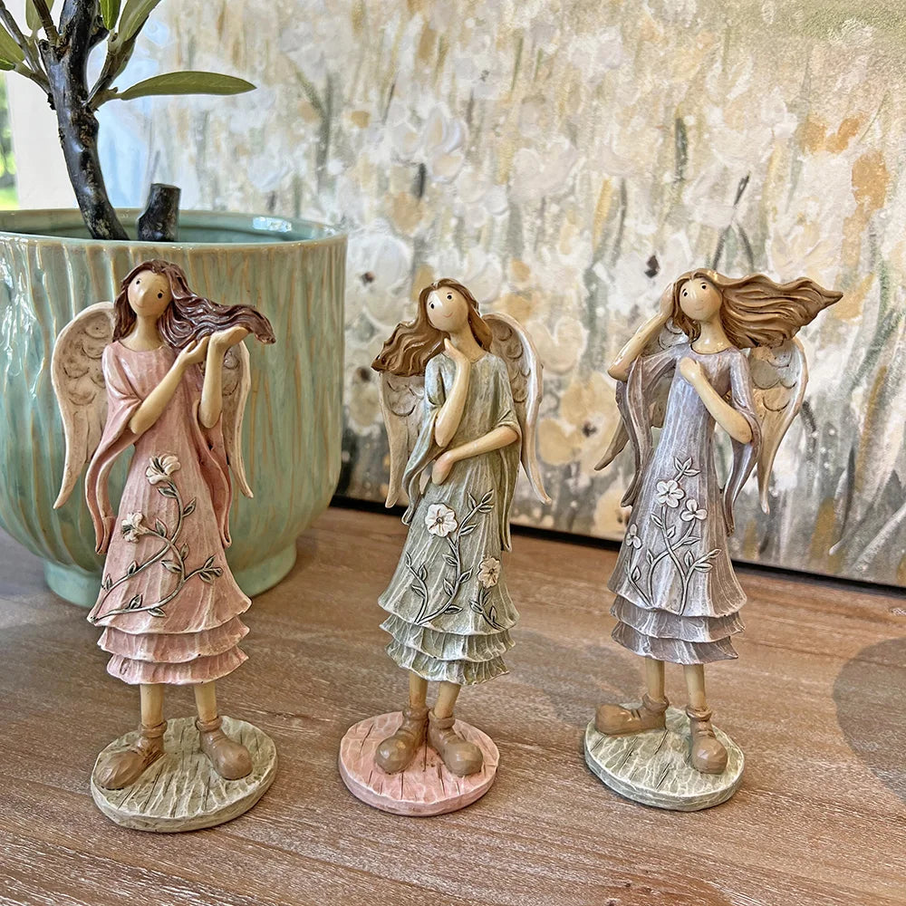 Smukke og dekorative englefigurer med fine detaljer. Disse engle er fremstillet i en blød, pastelfarvet stil, hver med sin egen unikke farve og blomsterdekorationer på kjolerne.