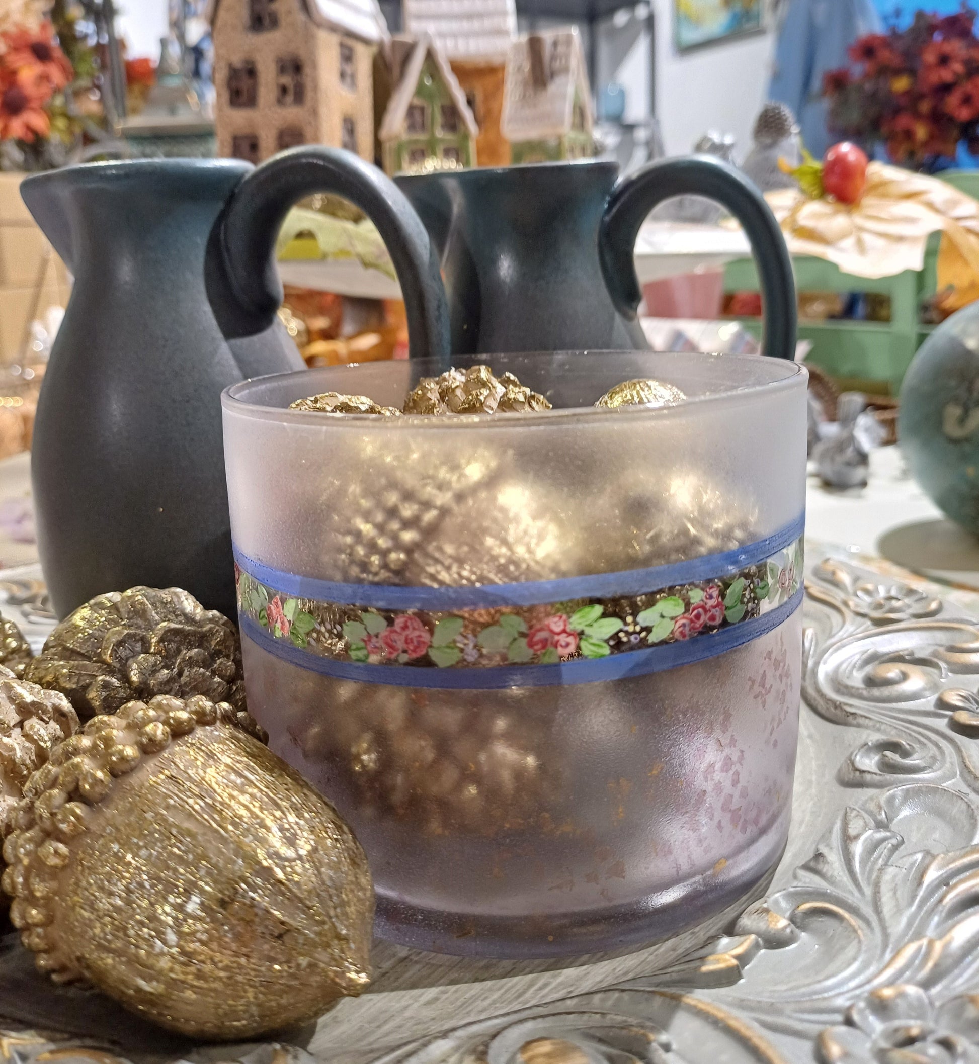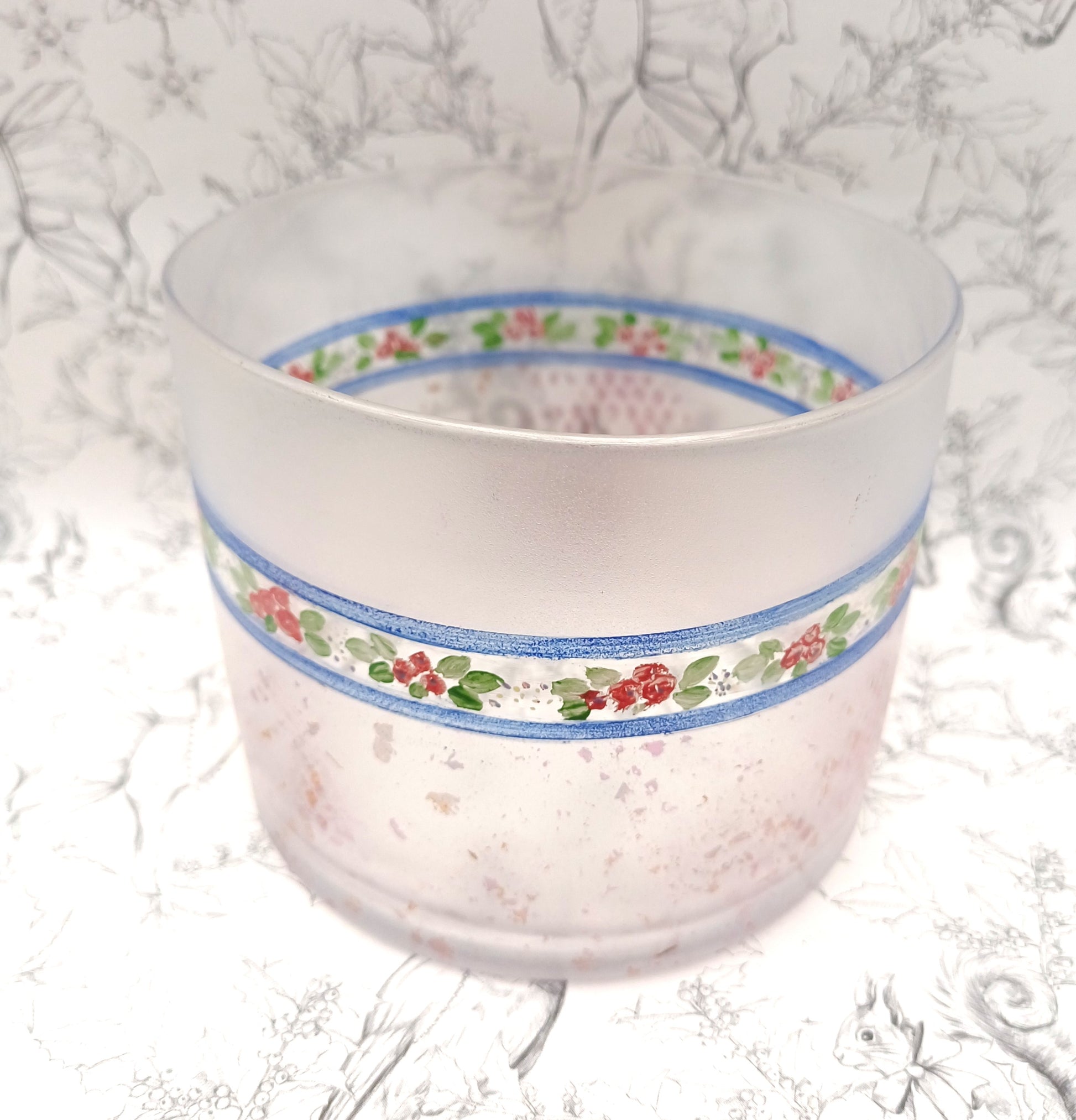 Unikt håndmalede skål, der kombinerer frosted glasmed kobber farvet mønster med fine håndmalede blomstermotiver. Med sin delikate og kunstneriske kant i pastelfarver er skålen både dekorativ og funktionel.