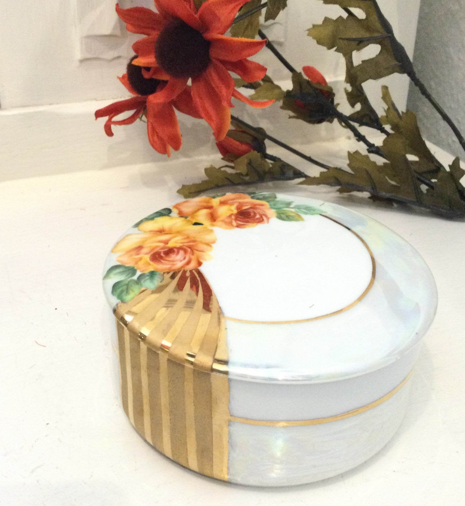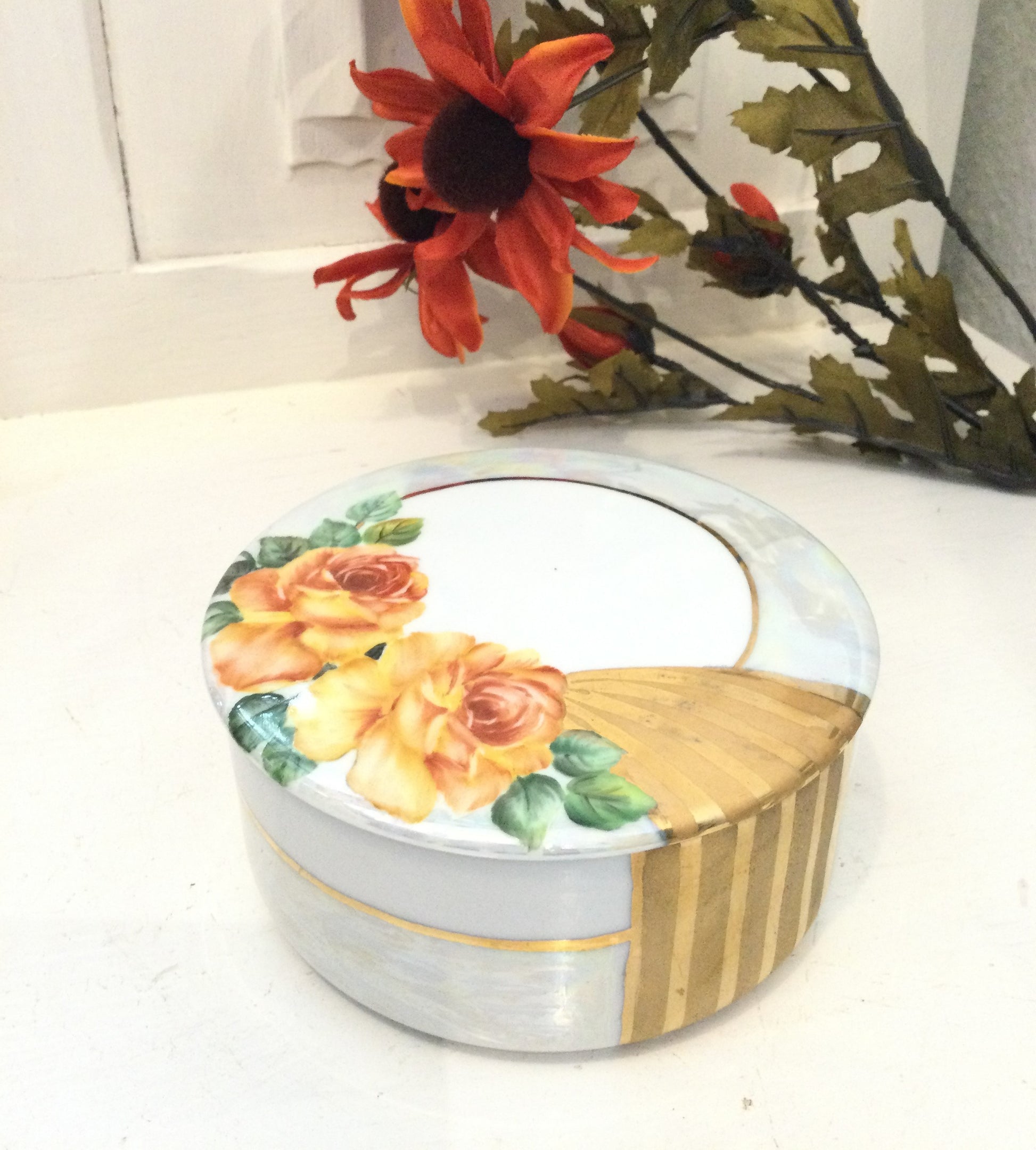 Sød porcelæns bonbon med gule og orange roser dekoreret med guld mønster.