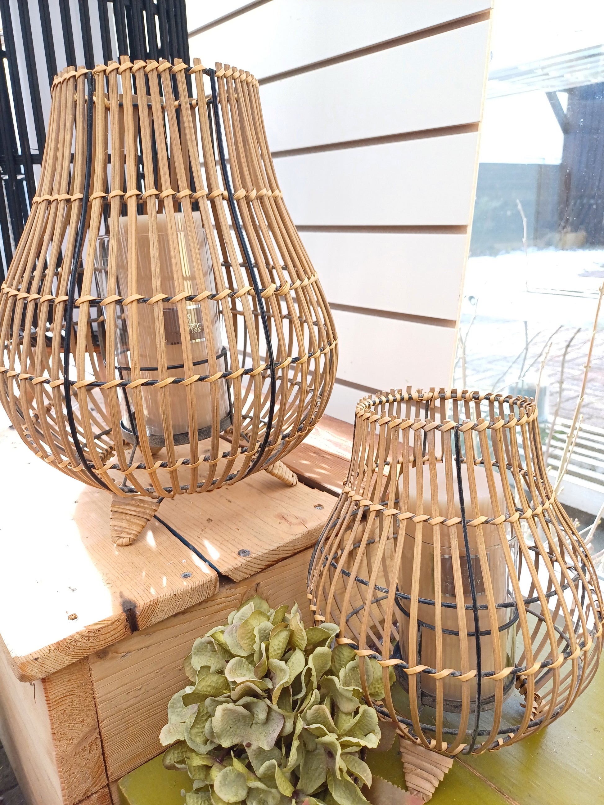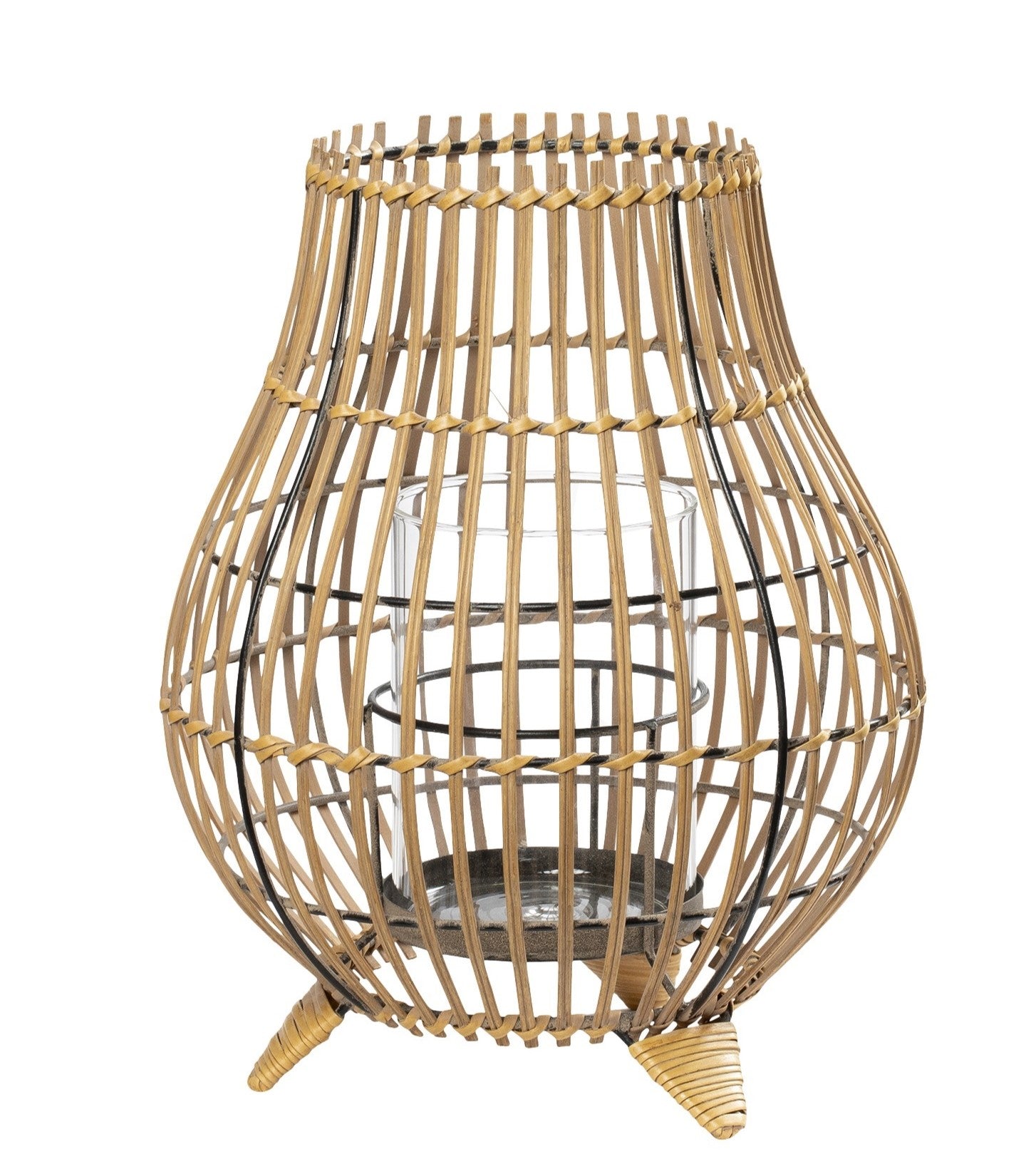 Denne smukke lanterne i naturligt flettet bambus kombinerer elegance og hygge i ét unikt design. Med sin organiske form og luftige struktur skaber lanternen en varm og stemningsfuld belysning, perfekt til både indendørs og udendørs brug. Indvendigt er der en glasindsats, der beskytter lyset og sikrer stabilitet.