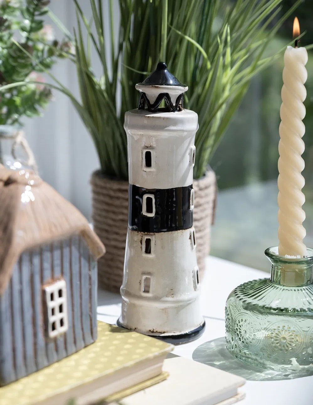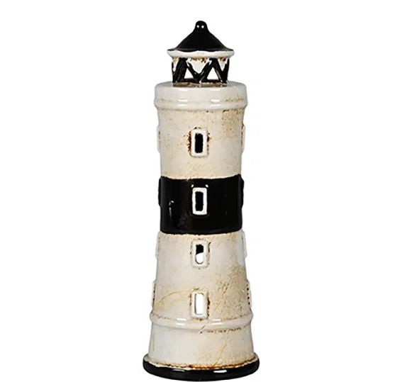 Sort og hvid fyrtårn keramik hus. Bring kyststemningen ind i dit hjem med dette smukke keramiske fyrtårn. Figurens enkle, håndlavede design med fine detaljer som små sprossede vinduer og en lille dør giver den et autentisk og hyggeligt udtryk. Perfekt som vinduespynt, på en reol eller som en del af en maritim indretningsstil.