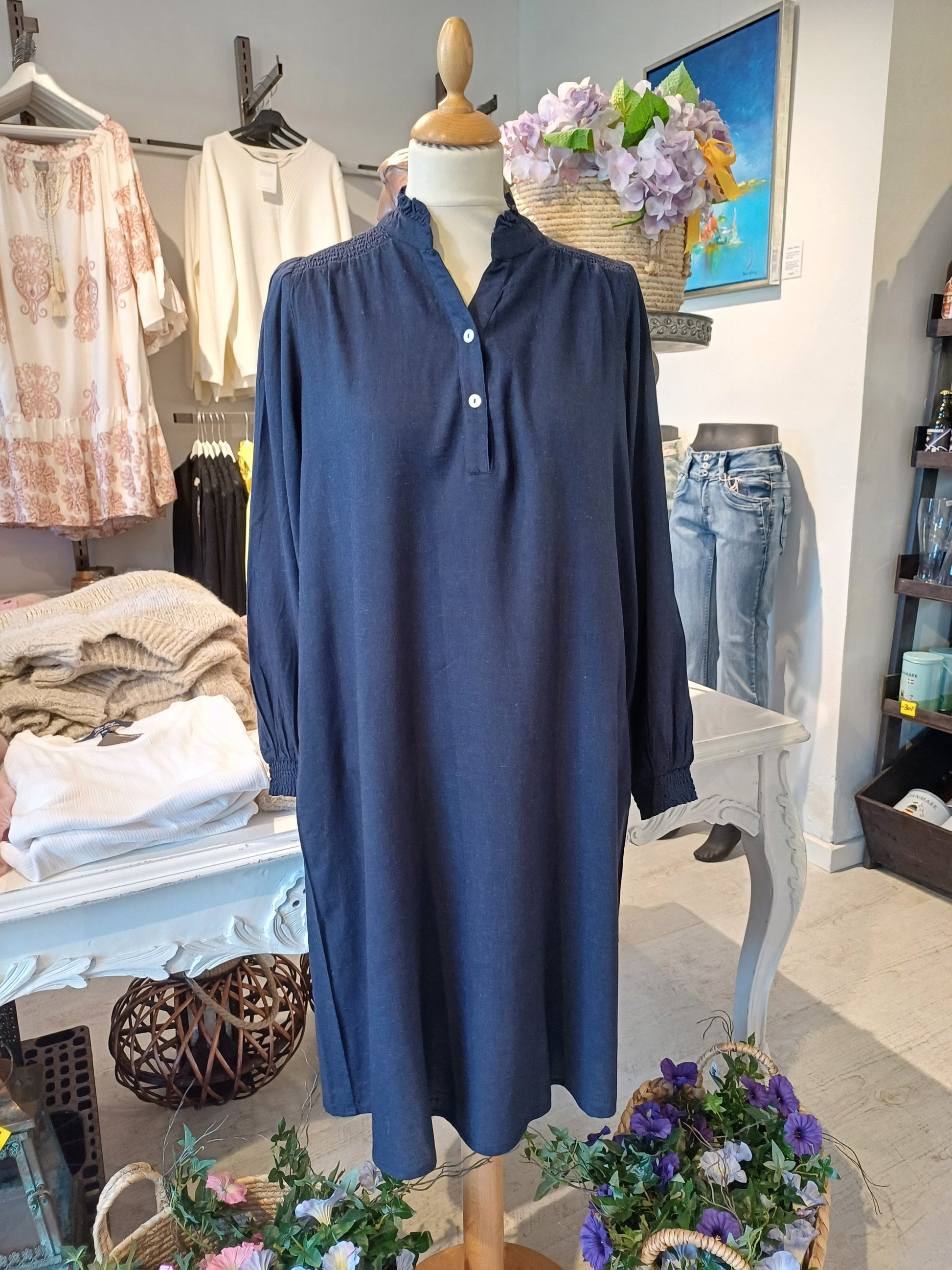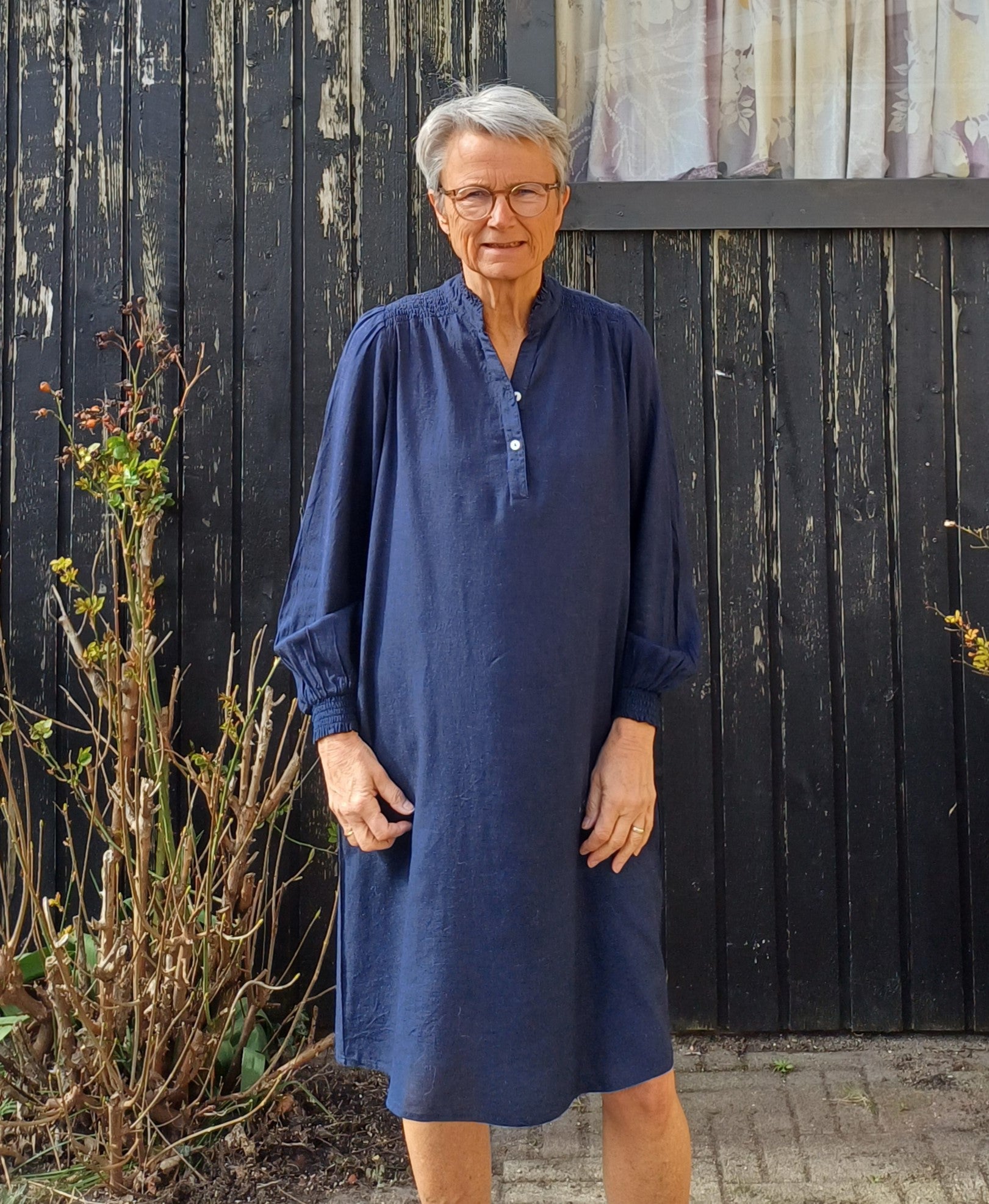 Kjolen har lidt vidde med skrå lommer. Lille flæse øverst på kraven, rynket mønstre på skulderne som giver en flot effekt. Stolpe lukning med 2 knapper. Lange ærmer med afslutning af et bredt elastik mønstre.