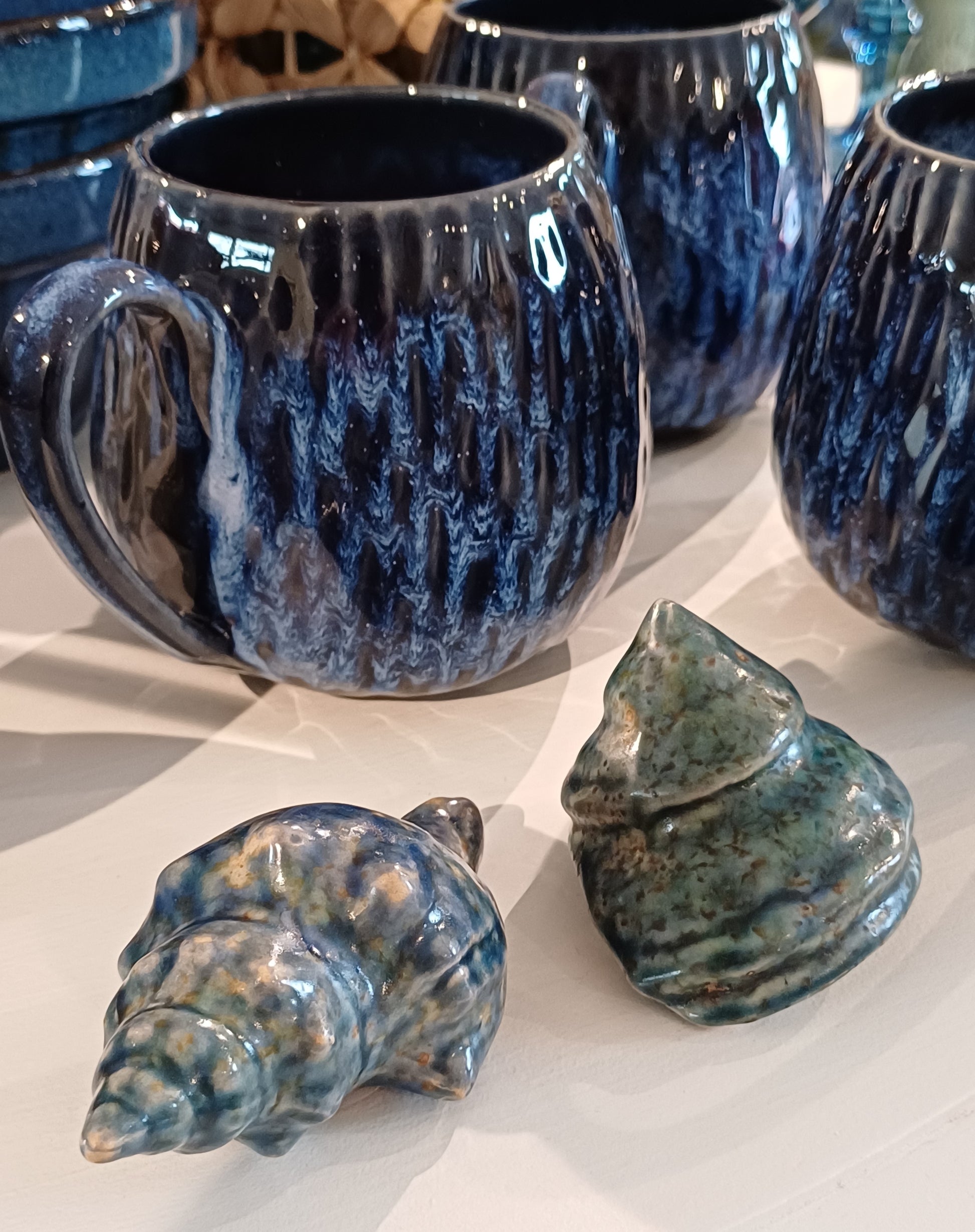 Blå muslingefigurer til dekoration.
