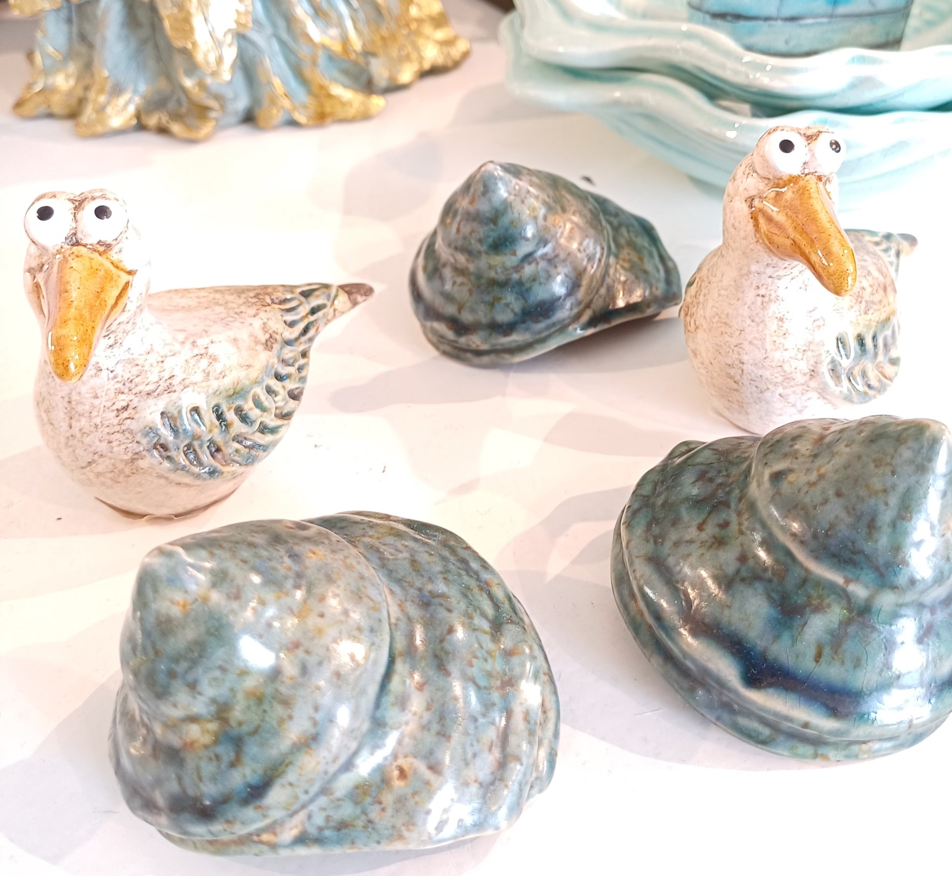 Søde dekoration muslinger og konkylier i rustik blå grønne glasur som passer til temaet sommer, strand og hav. Perfekt til dekoration i et sommerhus eller badeværelse som giver en stemning af strand og sommer.
