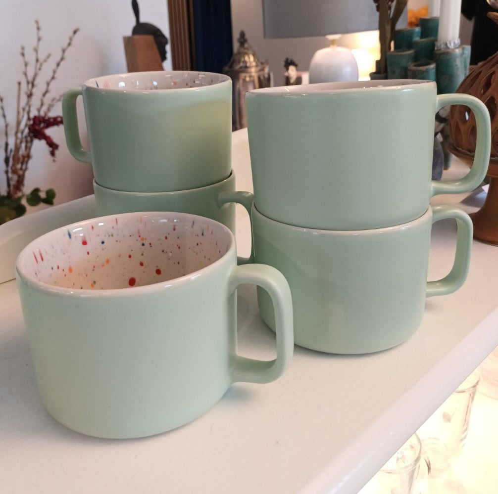 Breeze Party Krus 450ml, med et livligt Party-design indvendigt og en blød mat lysegrøn yderside. Denne elegante kombination bringer et forfriskende, moderne touch til din daglige rutine. Som en del af den livlige Party-kollektion blander dette krus stil og funktionalitet, hvilket gør det perfekt til enhver lejlighed.