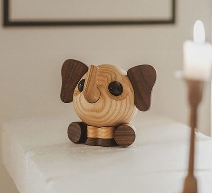 Håndlavet træelefant i massiv ask og valnød, skabt med sans for detalje og dansk designtradition.