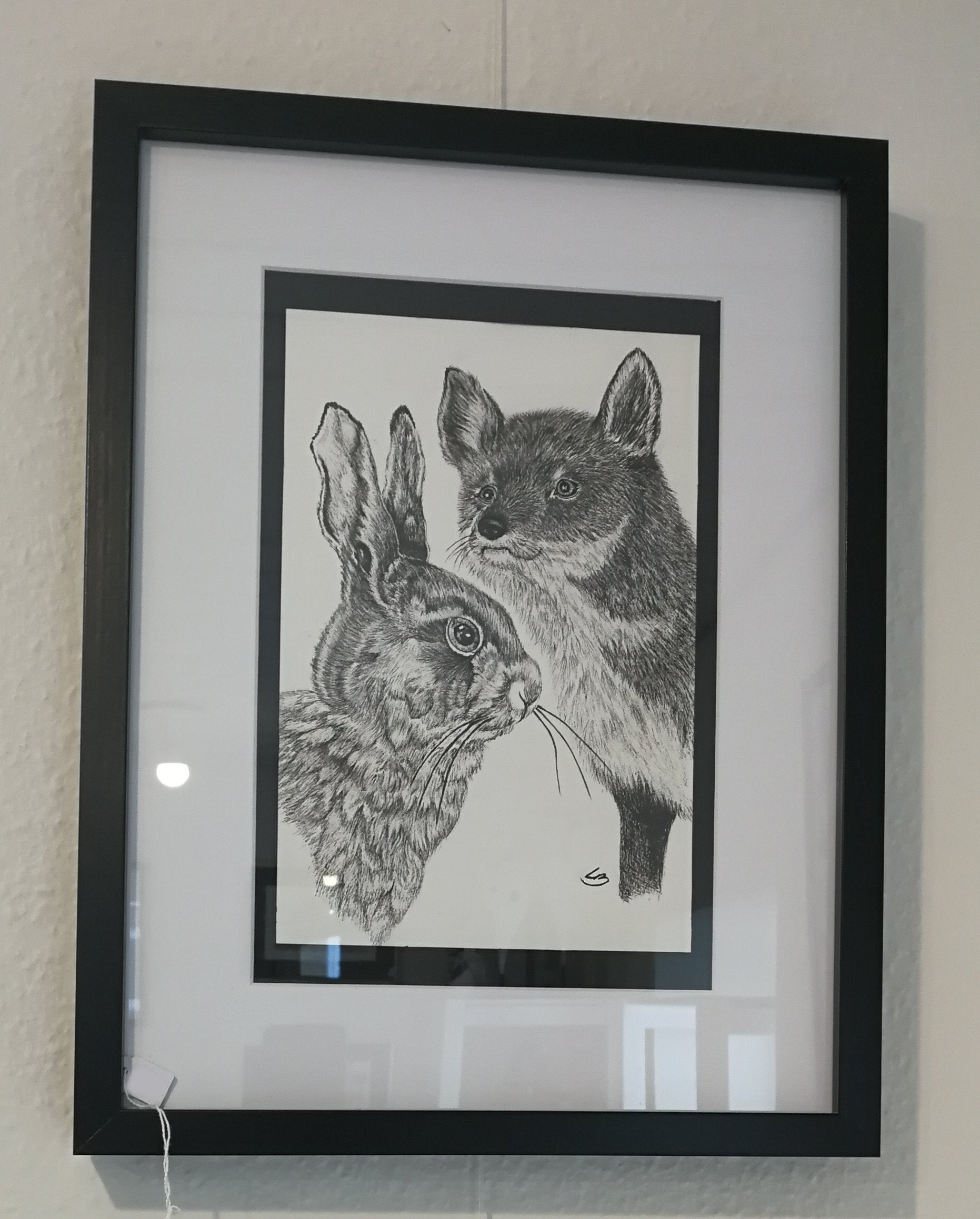 Elegant og naturtro håndtegning af en ræv og en hare, skabt med tusch i sort-hvid. Kunstværket fanger dyrenes udtryk og pelsstruktur med imponerende detaljegrad, hvilket skaber et livagtigt og stemningsfuldt motiv. Perfekt til dyreelskere og naturentusiaster, der ønsker en unik og tidløs vægdekoration.
