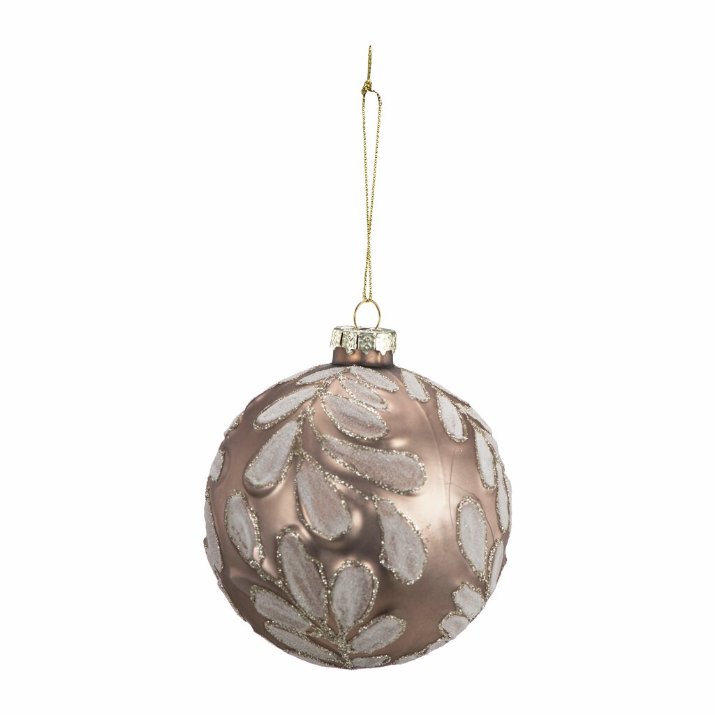 Skab julestemning med denne elegante julekugle i lyserød glas. Kuglen måler Ø10 cm og er dekoreret med grene et smukt lag glitrende glitter i guld og mat hvid , der fanger lyset og giver et festligt spil på juletræet.