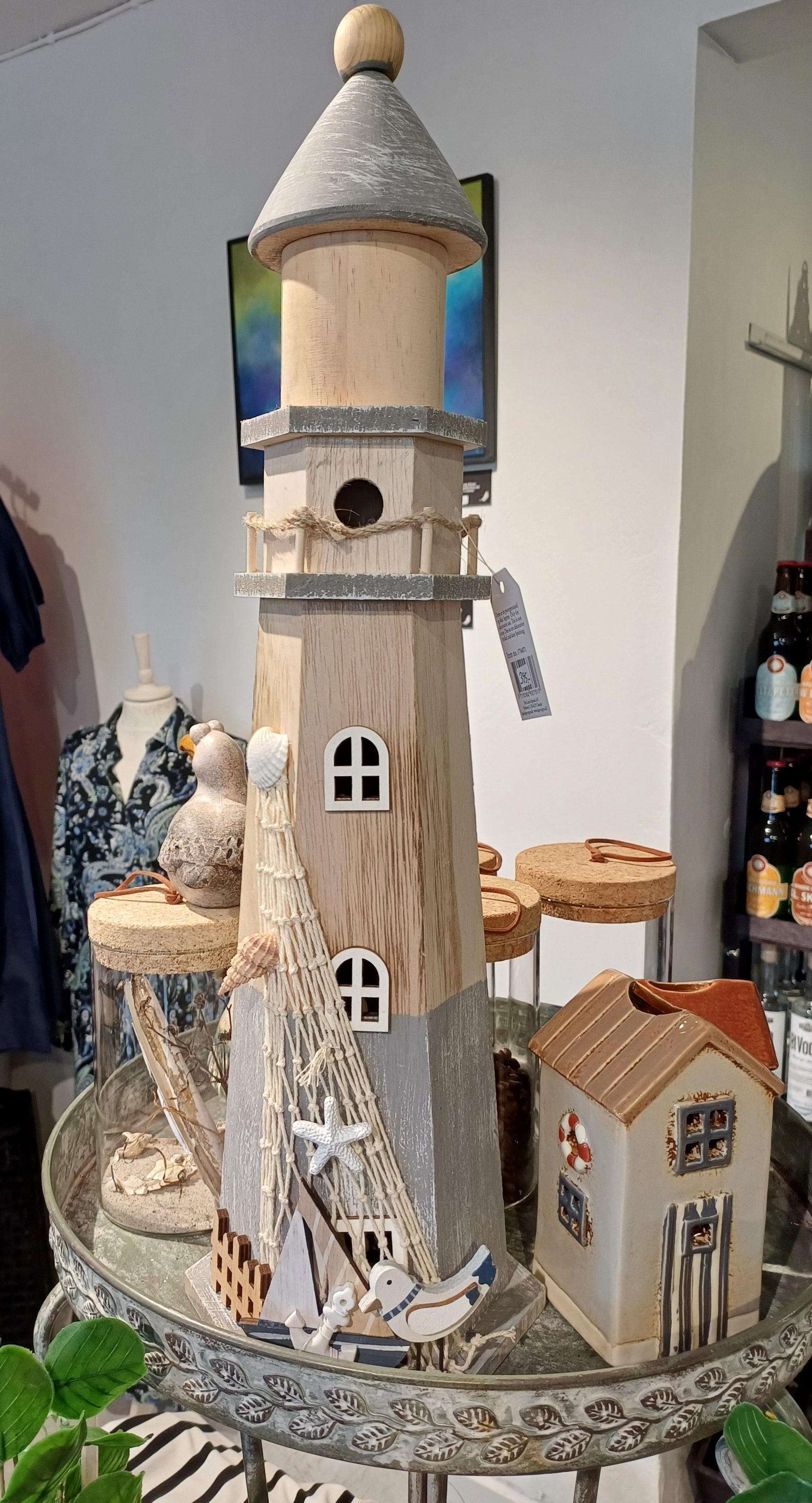 Sød enkelt og klassisk dekoration af et fyrtårn med lidt muslinger og ræb og måge.