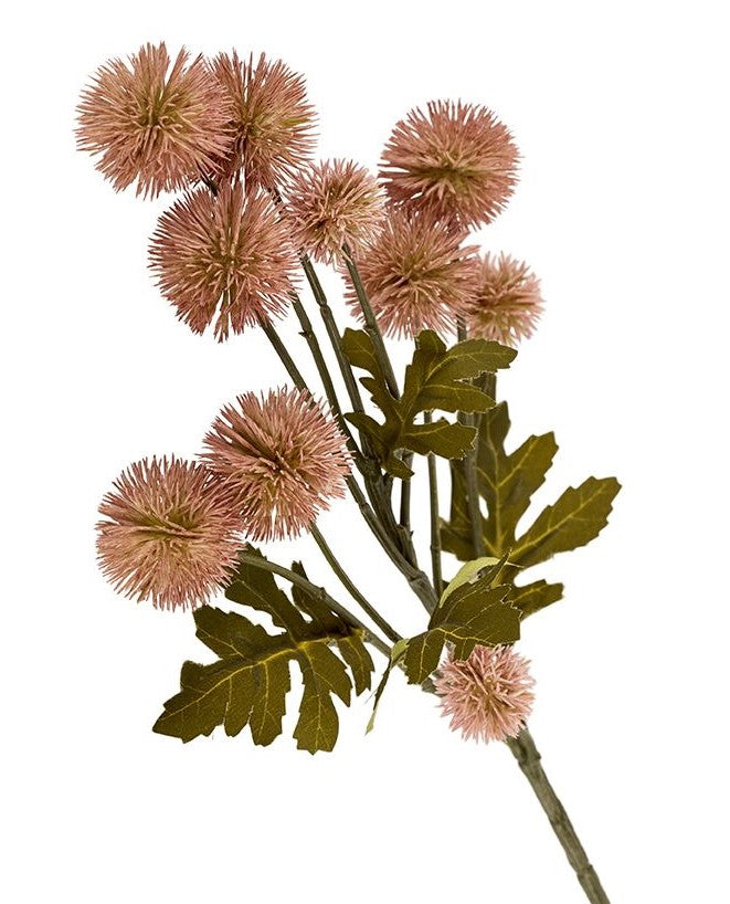Smuk kunstig blomstergren med lyserøde kugleblomster og detaljerede grønne blade giver et naturtro og dekorativt udtryk.