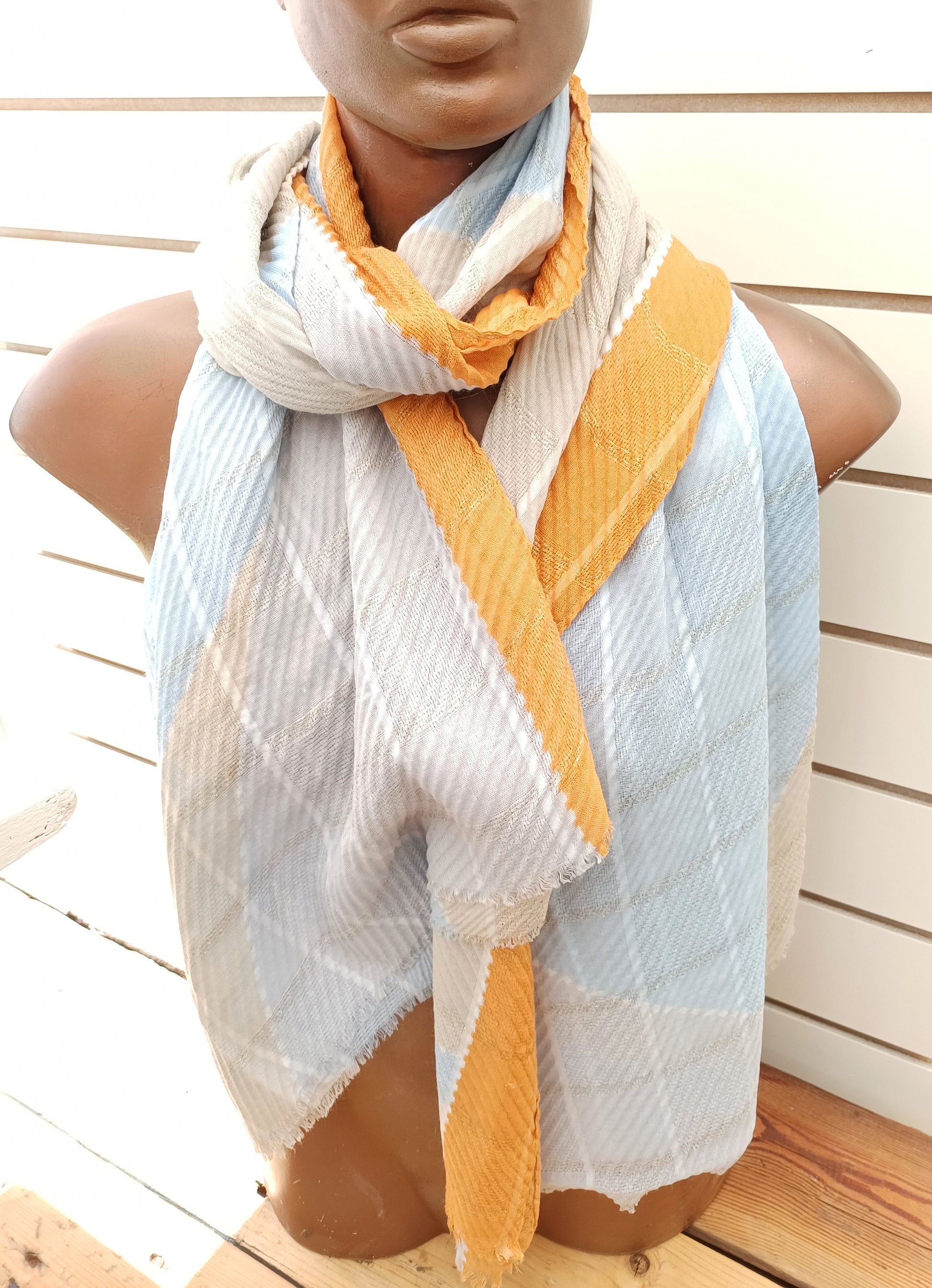 Langt tørklæde i med guldtråd i lyseblå, orange og grå farver.