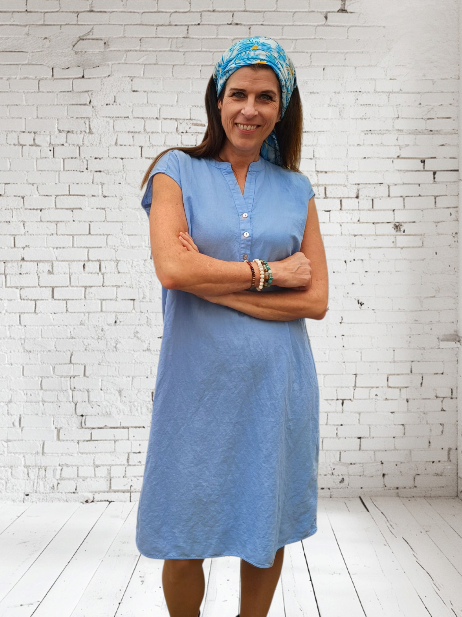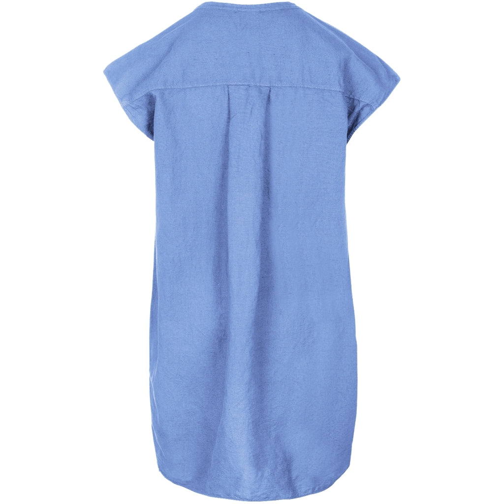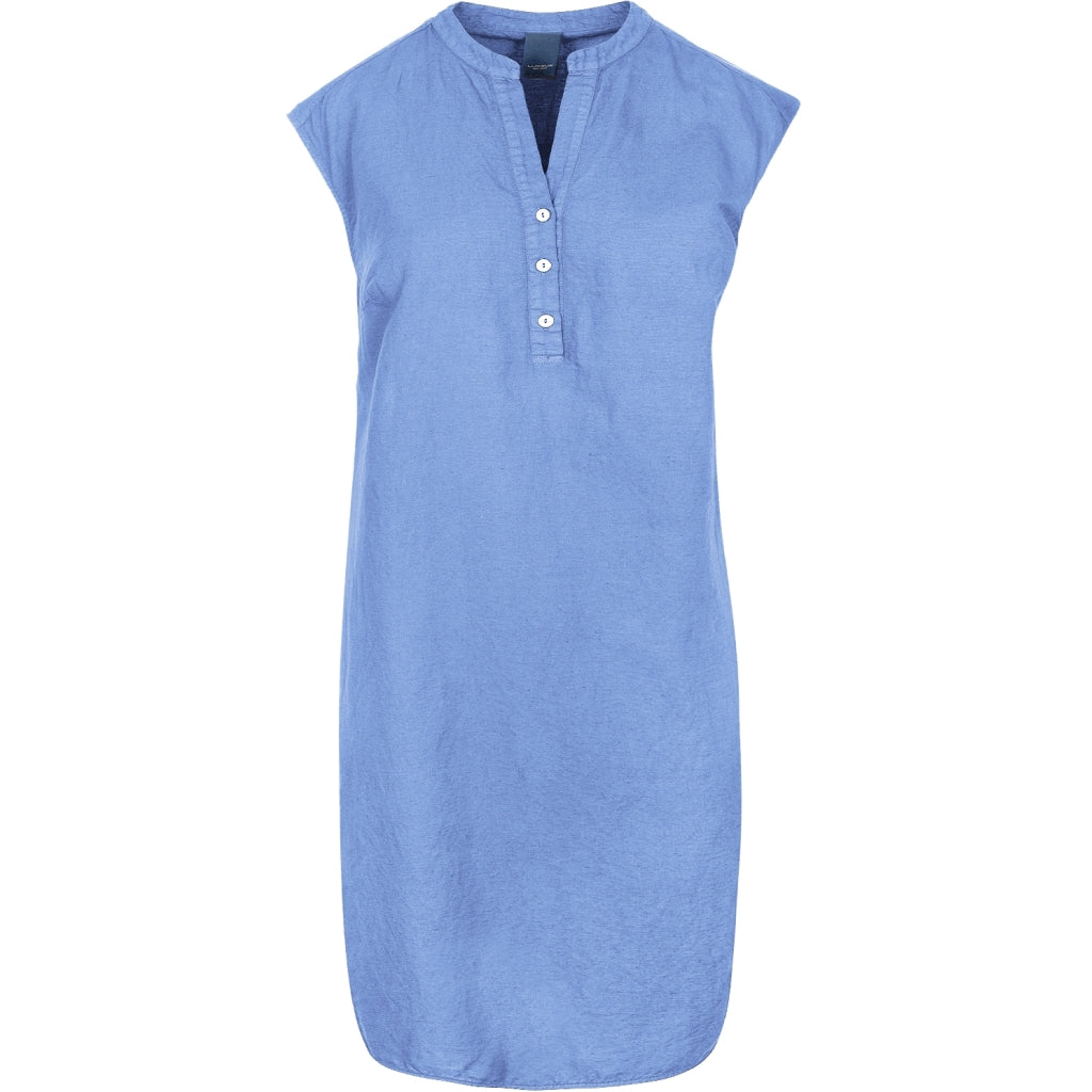 Flot og praktisk sommerkjole med hør med rund hals, der åbner op i et V og med 3 knapper. Ryggen har en overskæring med lidt rynk. Bundkanten er flot afrundet i siderne, som giver en fin slids effekt.