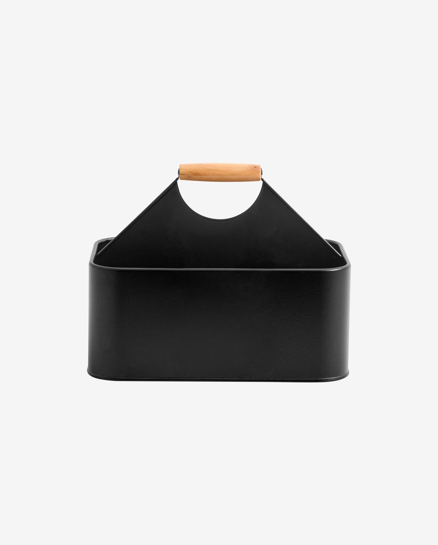 Opbevaringsbakke i sort jern med hank i træ.