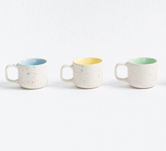 Hver kop er lavet i holdbart stentøj med en smuk, håndmalet farve på indersiden og sjove farvesprøjt udenpå. De fine pastelfarver giver et legende udtryk, perfekt til både hverdag og gæster.