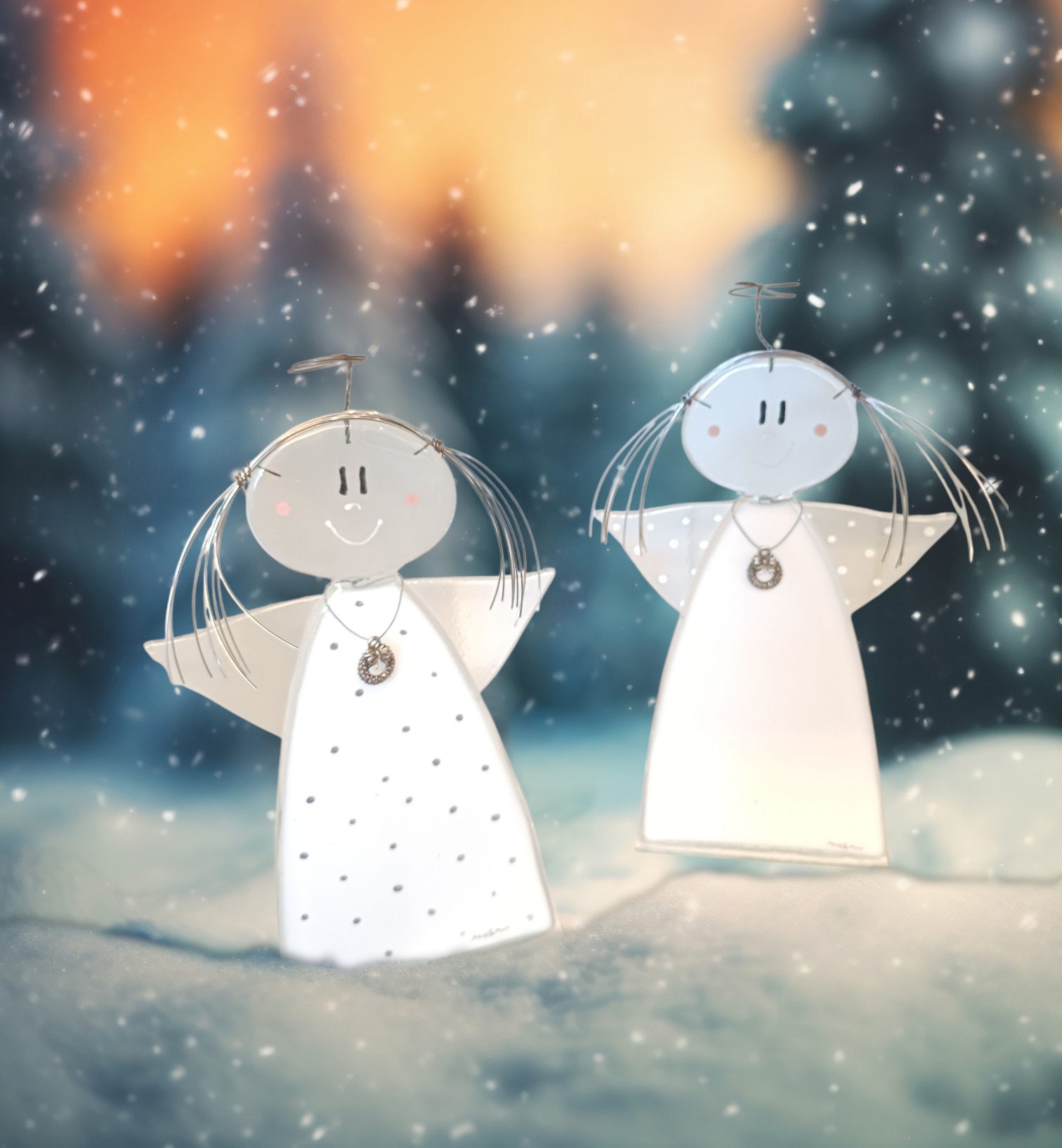 Bring lys, ro og et strejf af poesi ind i dit hjem med en Håndlavet Penny Engle til fyrfadslys. Disse yndige glasengle er skabt med omhu og finesse, hvor hver detalje – fra de fine metalhår til de blide kinder – fortæller en historie om kunsthåndværk og hjerte. Englene fungerer både som stemningsfulde fyrfadsstager og dekorative figurer, perfekte til vindueskarmen, julepynt eller som en betænksom gave til én, du holder af. Håndlavet i smukt opal- og klart glas