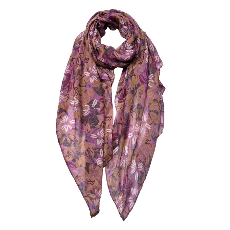 Flot stort tørklæde med blomster i pink, lilla og brune nuancer.
