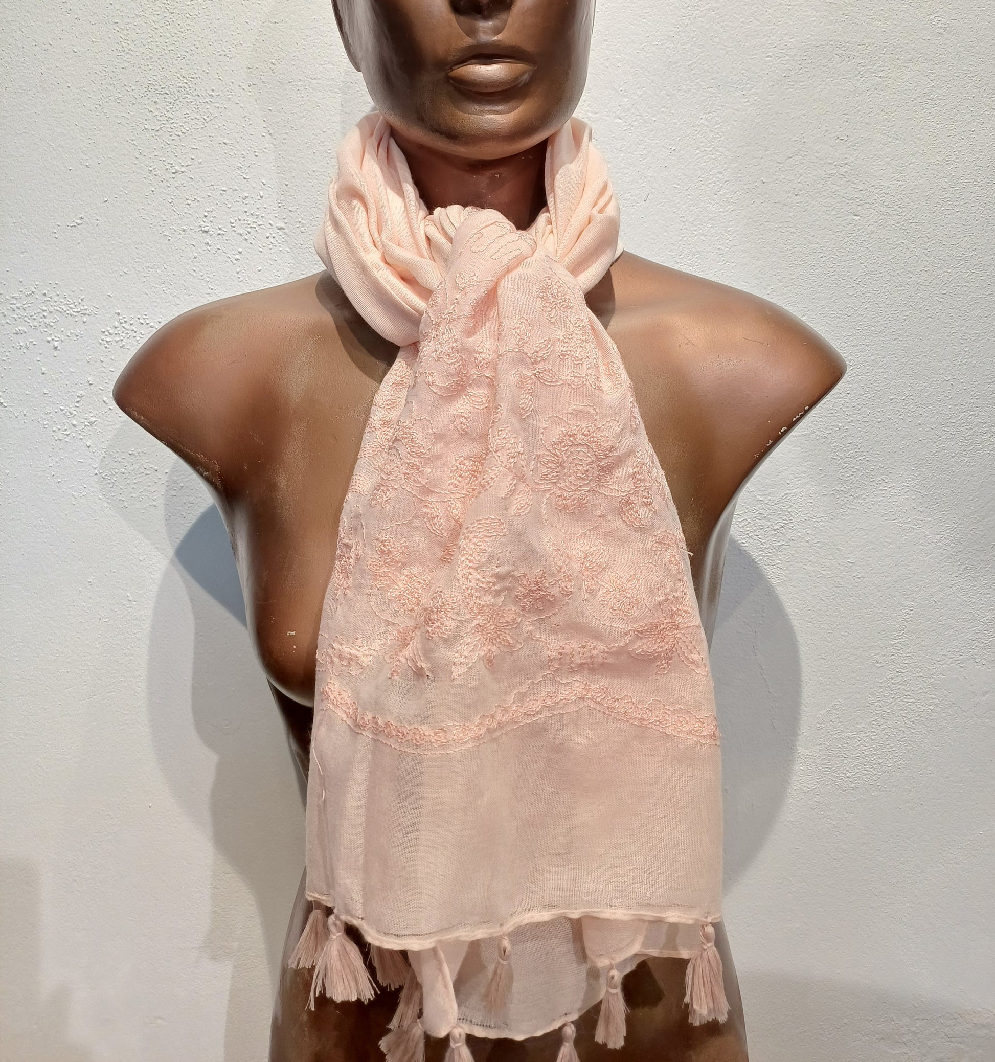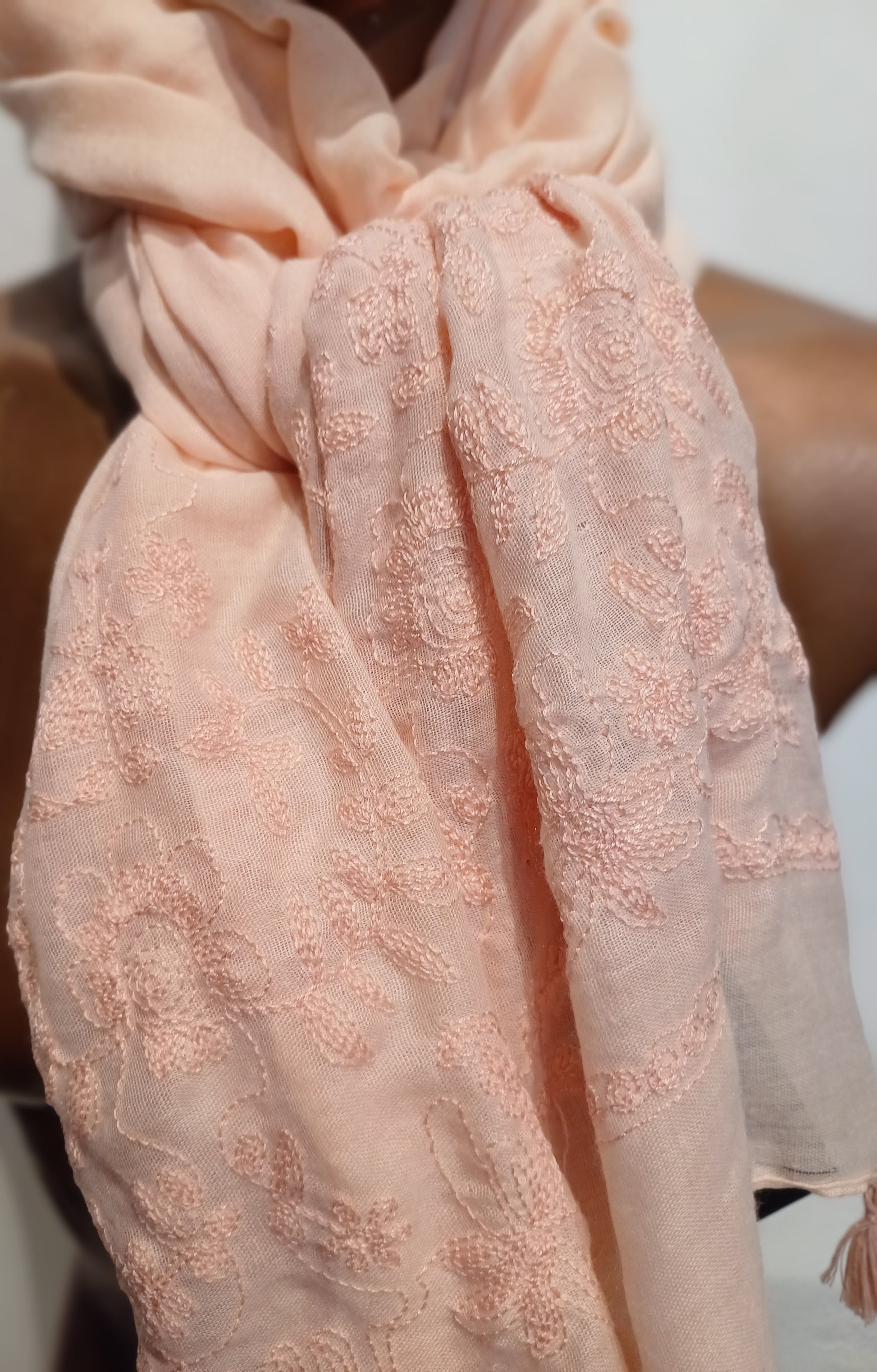 Fersken farvet tørklæde med broderi.
