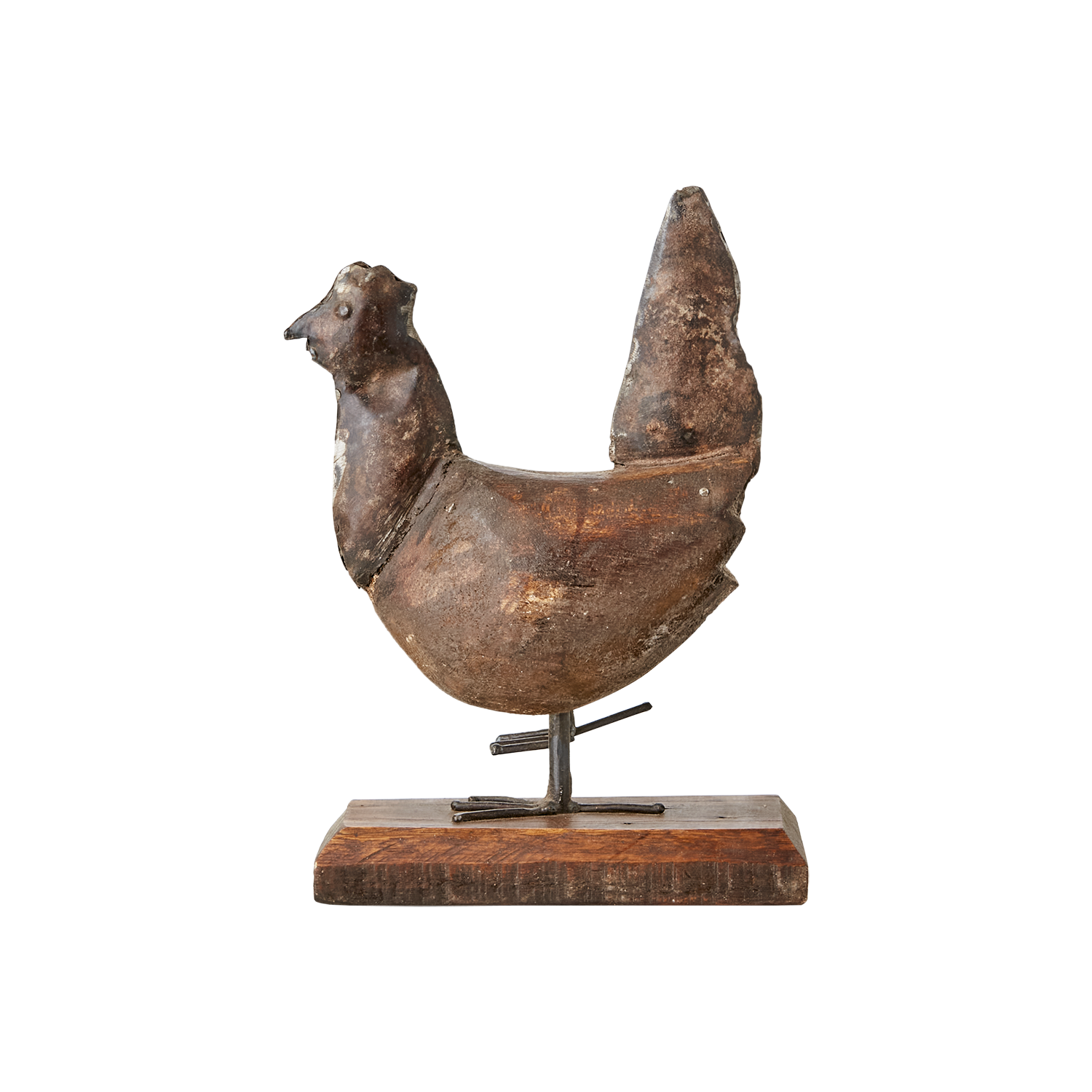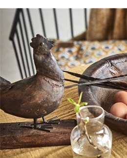 Dekorativ stor hønefigur i træ og metal. Dens rustikke look og mørke farve gør at passer til mange boligindretninger. Den sætter prikken over i ét dog uden at blænde.