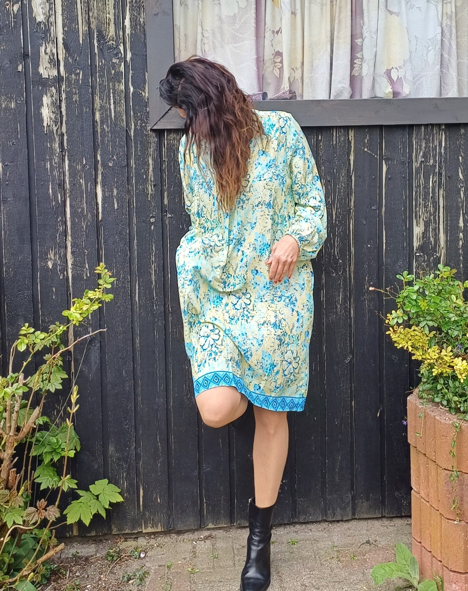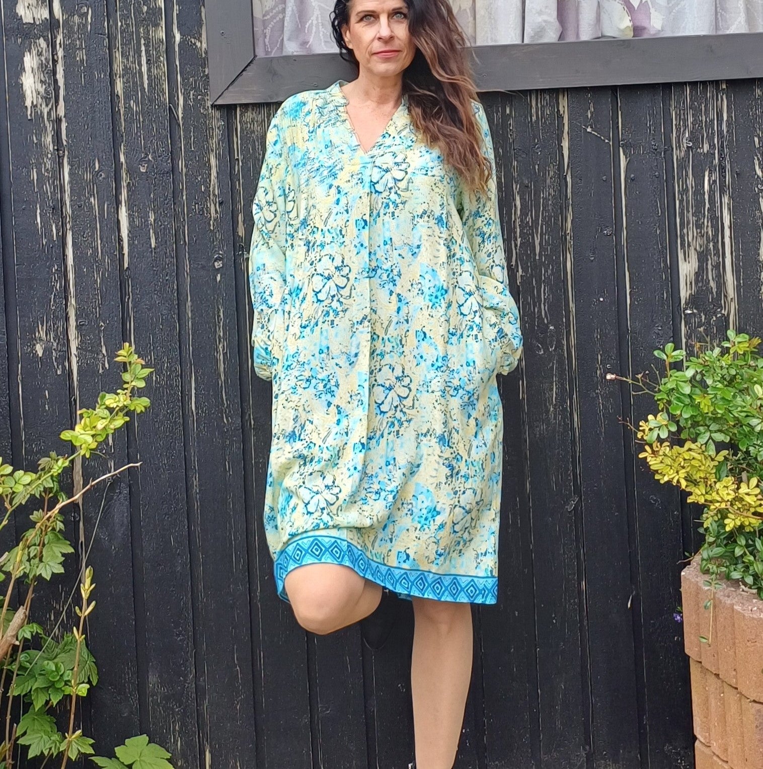 Dejlige afslappende tunika med friske farver, turkis og grønne mønstre. Tunikaen er løs siddende med lange ærmer med elastik. Lille kina krave og v-hals. Tunikaen enkelt og klassisk som både kan dresset op og ned efter hvad lejlighed den skal bruges til.