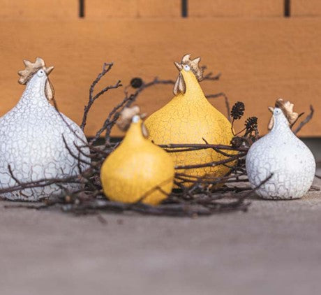 Tilføj charme og personlighed til dit hjem med disse søde kyllingefigurer i forskellige farver. Sættet består af tre kyllinger i hvid, gul og brun med en elegant krakeleret finish og farvet detaljer, der giver et rustikt og stilfuldt look. Perfekt som dekoration i køkkenet, stuen eller på påskebordet