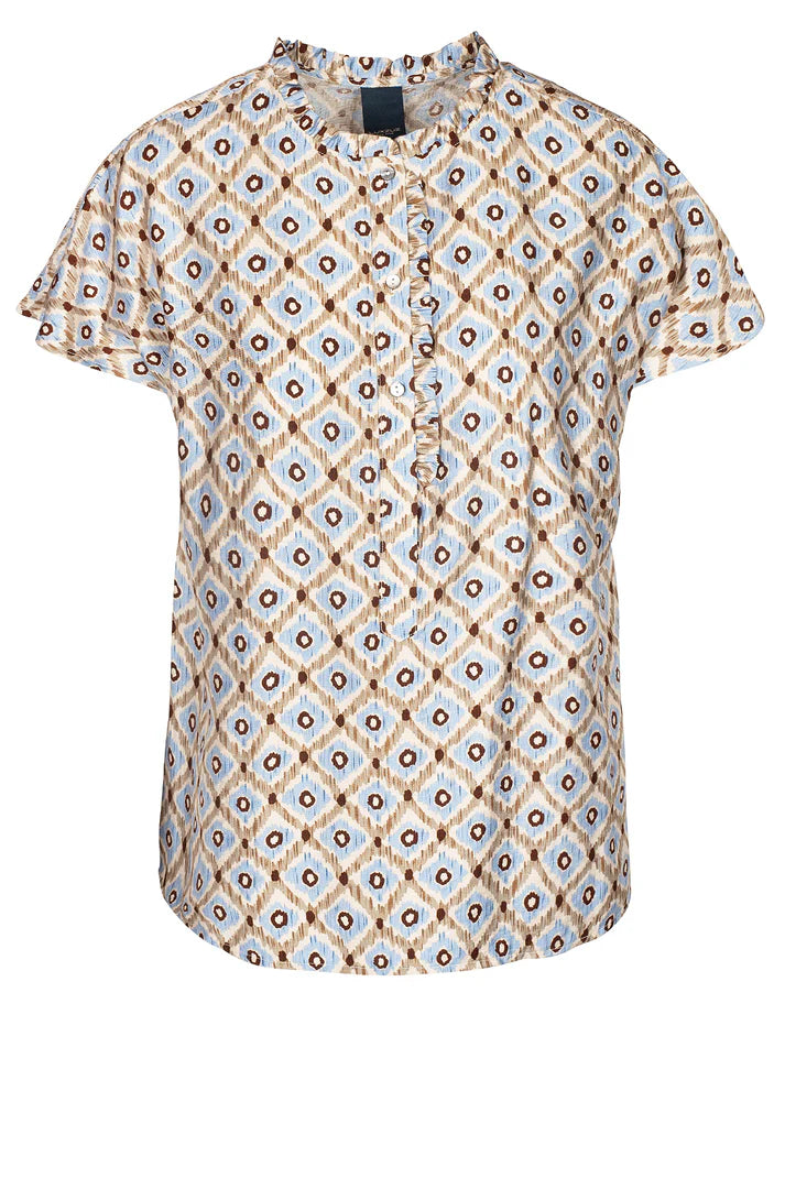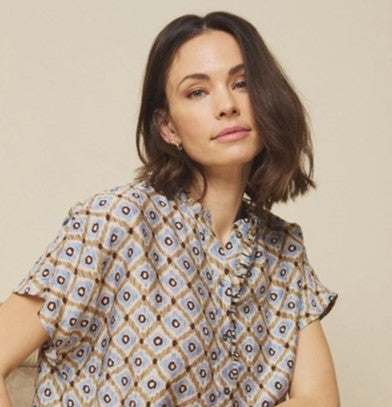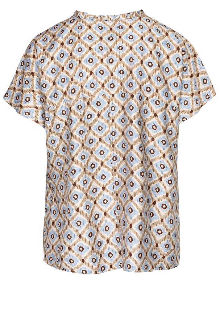 Sød mønstret bluse har et feminint og let design med små flæsedetaljer langs halsåbningen. Den har en knaplukning foran og korte ærmer. Blusen er i en let og luftig pasform og har et utroligt smuk mønster i smukke farver.