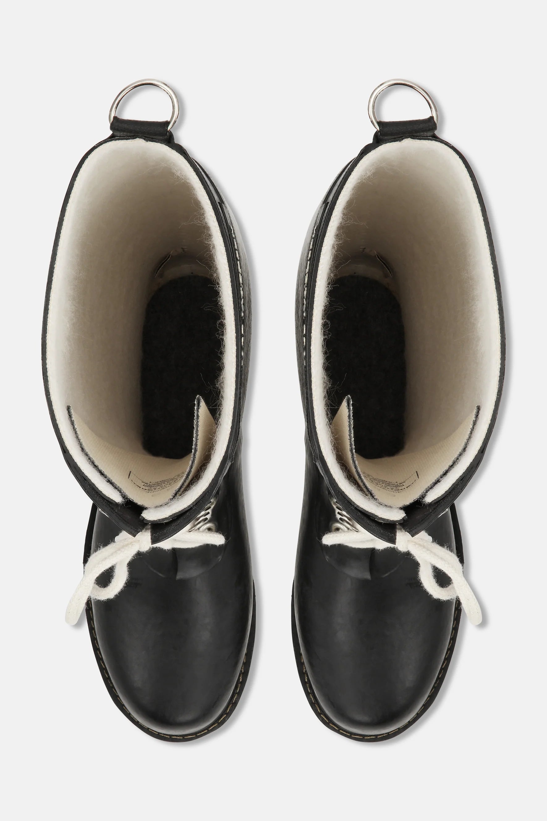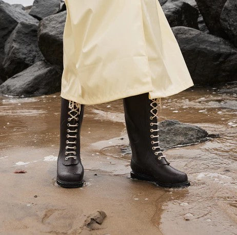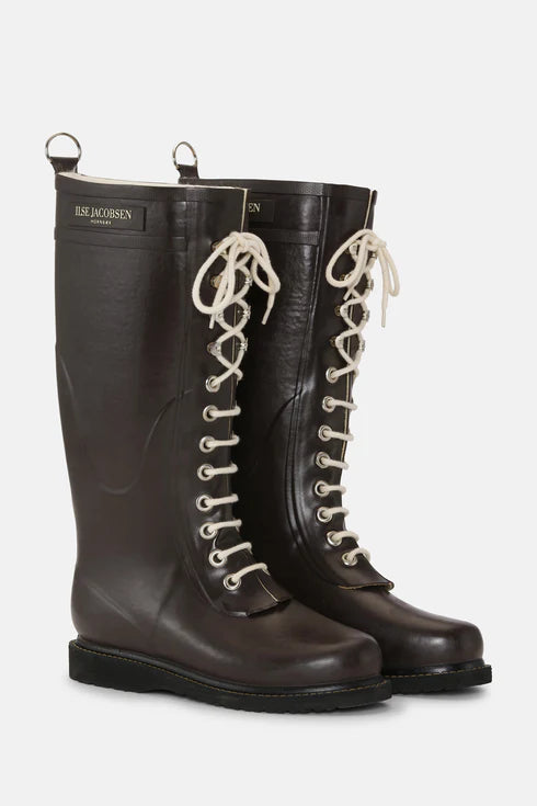 De ikoniske gummistøvler med snøre fra Ilse Jacobsen Hornbæk. Disse knælange gummistøvler har en dekorativ D-ring bagpå samt logo på skaftet.