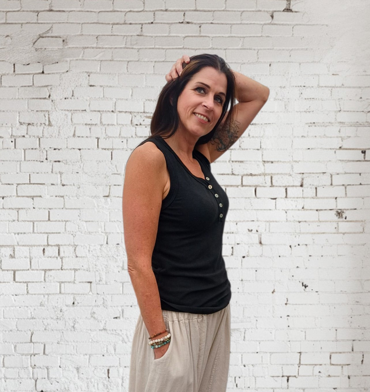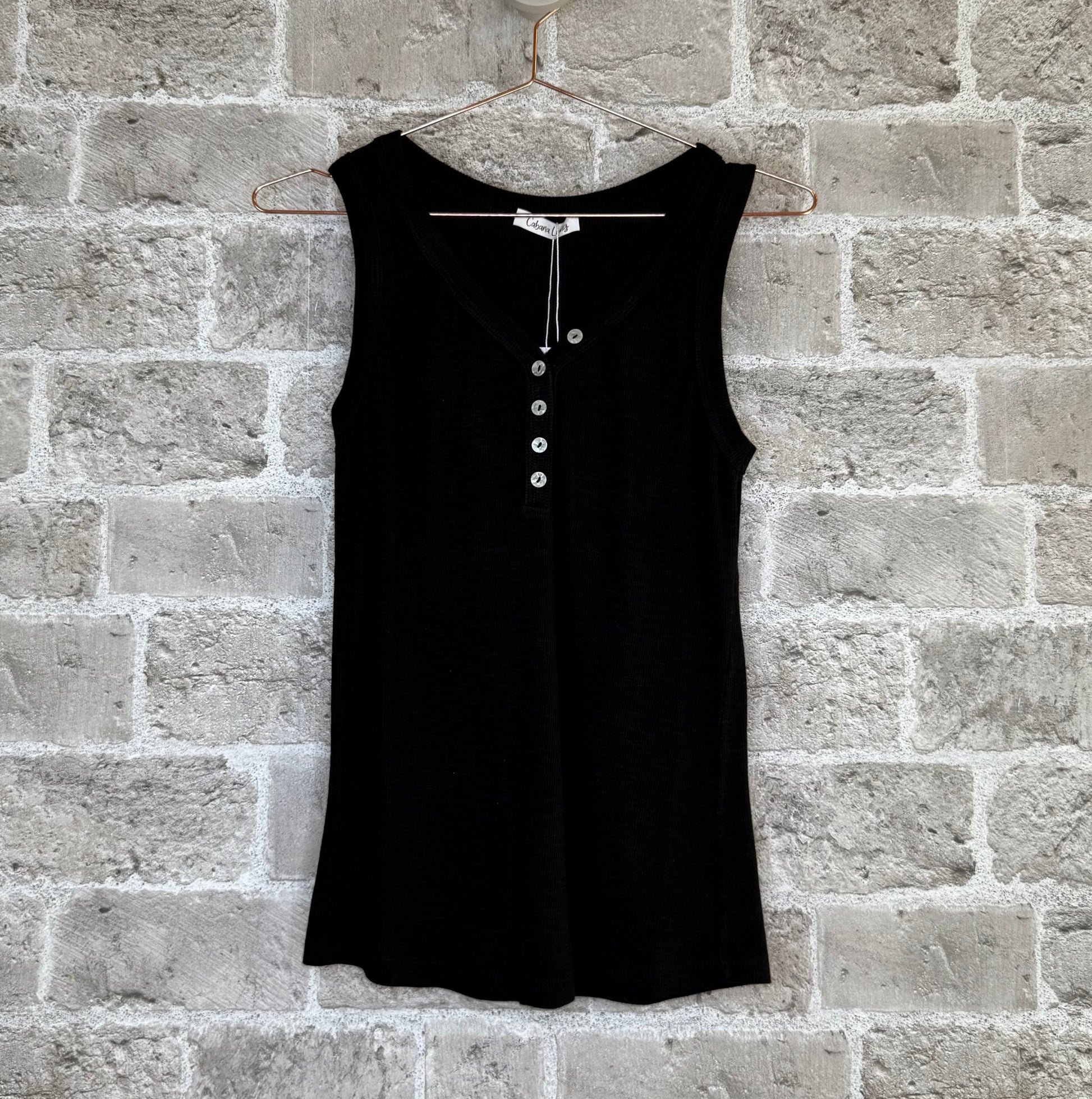 Sort top med v-hals og knapper. Brede stropper med ribkant hele vejen rundt.
