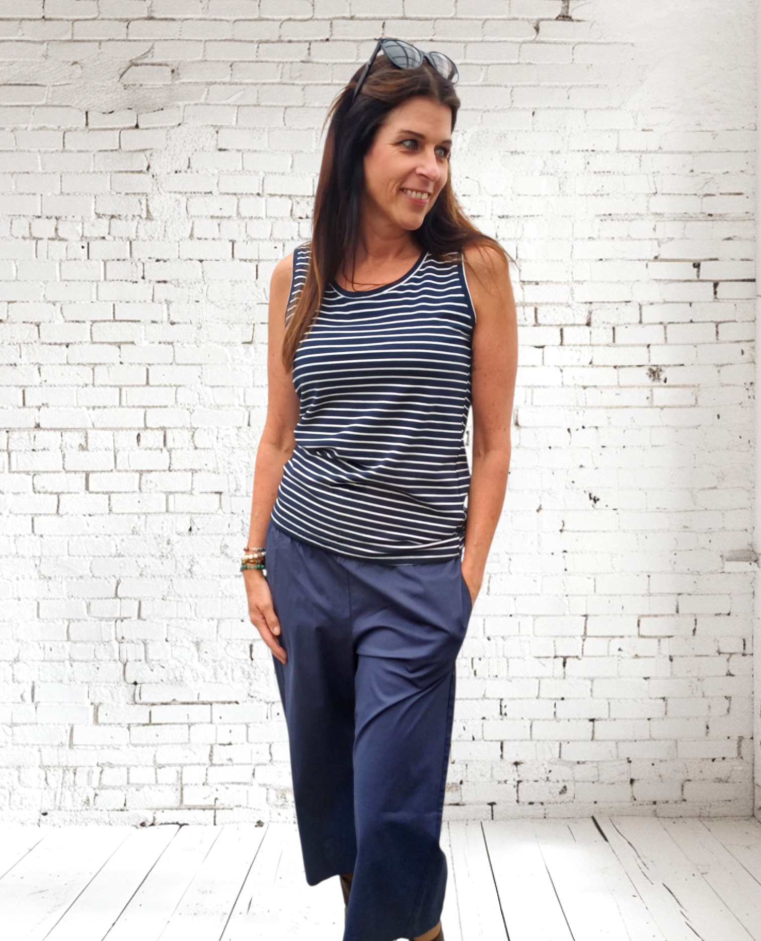 Super skøn bred buks med 3/4 lange ben, buksen har elastisk linning samt lommer i hver side.